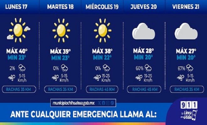Ciudad de Chihuahua.- La Coordinación de Protección Civil Municipal informa que para esta semana se pronostican temperaturas máximas de 40°C con mínimas de 20°C; así como para el jueves y viernes se esperan lluvias de más del 60 por ciento.