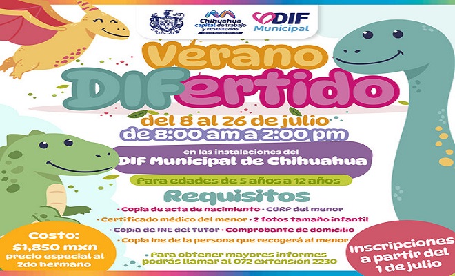 Dirigido a los NNA de 5 a 12 años de edad, «Verano DIFertido” contará con diversas actividades en las instalaciones del DIF Municipal, en centros comunitarios y Centros de Desarrollo Familiar (CEDEFAM) así como en asentamientos tarahumaras.