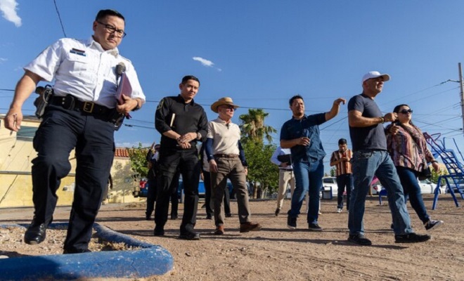 Ciudad de Chihuahua.- El alcalde Jorge Cruz Russek, realizó un recorrido en la colonia Arboledas, en seguimiento a las estrategias de seguridad que se han implementado en la colonia para brindar paz y tranquilidad a las familias del sector.