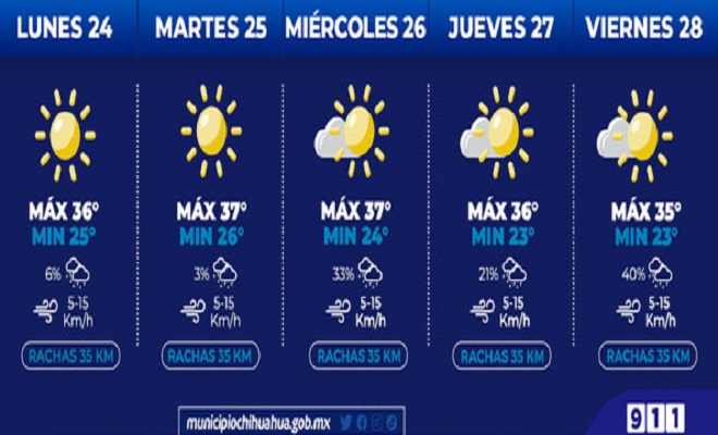Ciudad de Chihuahua.- La Coordinación de Protección Civil Municipal, informa que para esta semana se pronostican temperaturas máximas de 37°C con mínimas de 23°C, además se prevén lluvias ligeras entre miércoles y viernes particularmente.