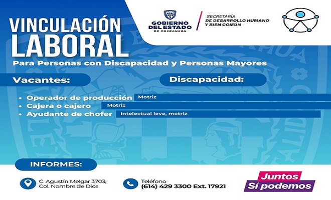 Ciudad de Chihuahua.- La Secretaría de Desarrollo Humano y Bien Común (SDHyBC), a través de la Dirección de Grupos Vulnerables y Prevención a la Discriminación, anunció las vacantes laborales disponibles esta semana para personas con diferentes discapacidades.