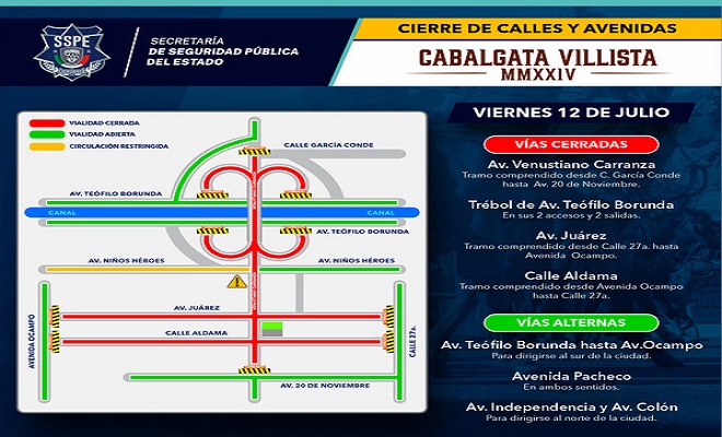 Ciudad de Chihuahua.- La Secretaría de Seguridad Pública (SSPE), a través de Movilidad del Estado, informa a la ciudadanía que a partir de las 14:00 horas del viernes 12 de julio, las calles y avenidas del sector centro de Chihuahua capital permanecerán cerradas con motivo de la Cabalgata Villista 2024.