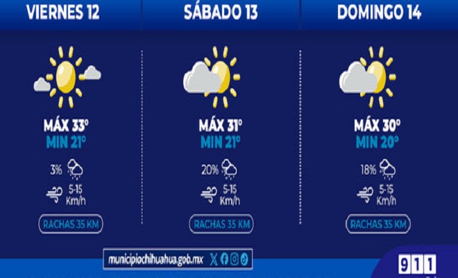 Ciudad de Chihuahua.- Para este fin de semana, del 12 al 14 de julio, se prevén temperaturas máximas de 33°C y mínimas de 20°C, informó La Coordinación Municipal de Protección Civil.