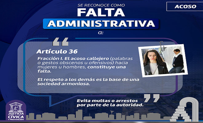 El subdirector de Justicia Cívica y Prevención, Ramón Regalado Morales, informó que el acoso callejero es aquella acción que a través de gestos obscenos o sexosos, palabras soeces o indecorosas, se puede agredir a alguien en algún espacio público, sin importar su sexo, etnicidad, condición, preferencia sexual o nivel socioeconómico.