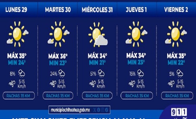 El jueves, se espera una máxima de 34°C y una mínima de 23°C, con cielo mayormente soleado y 15 por ciento de probabilidad de lluvia y para el viernes, la temperatura alcanzará los 35°C con una mínima de 22°C, cielo mayormente soleado y mínima probabilidad de lluvia.