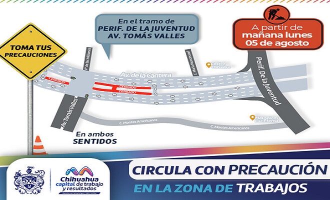 Ciudad de Chihuahua.- La Dirección de Obras Públicas, dio a conocer que a partir de mañana lunes 05 de agosto se verá afectada la circulación vehicular continua en la avenida De la Cantera en ambos sentidos en el tramo de Periférico de la Juventud a avenida Tomás Valles en los carriles continuos al camellón central, debido a mejoras en la distribución vial en la zona.