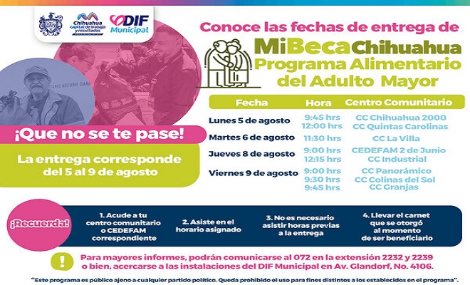 Ciudad de Chihuahua.- El DIF municipal, informa a las y los solicitantes del Programa Alimentario del Adulto Mayor (PAAM) los centros comunitarios y horarios a los que podrán acudir por su entrega del 5 al 9 de agosto: