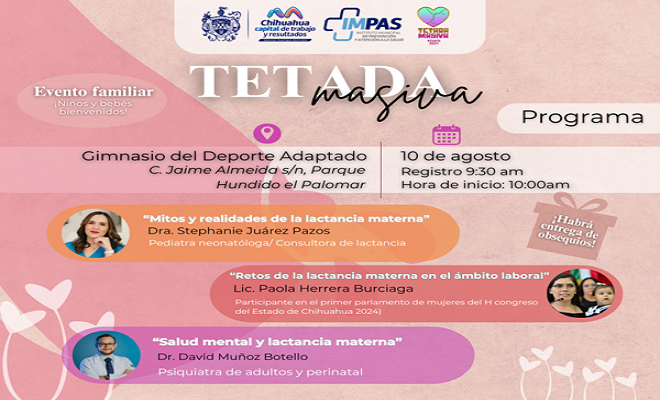 Ciudad de Chihuahua.- El Instituto Municipal de Prevención y Atención a la Salud (IMPAS), y el colectivo Tetada Masiva Chihuahua, invitan a las familias de la capital a la Tetada Masiva 2024, este sábado 10 de agosto en el Gimnasio del Deporte Adaptado “Manuel Trueba” ubicado en el Parque Hundido en la colonia El Palomar.