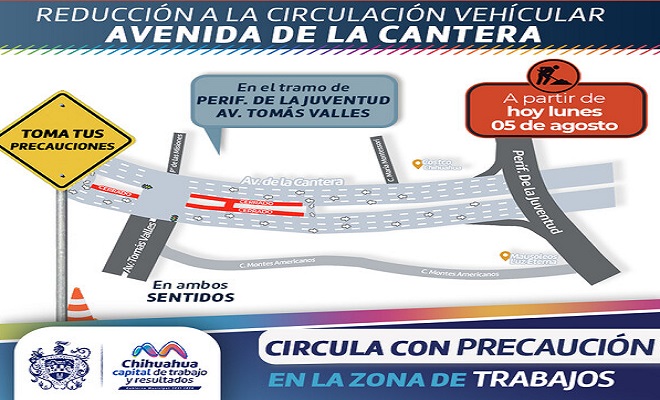 Ciudad de Chihuahua.- La Dirección de Obras Públicas, recuerda que a partir hoy 05 de agosto se verá afectada la circulación vehicular en la avenida De La Cantera en ambos sentidos en el tramo de Periférico de la Juventud a avenida Tomás Valles en los carriles continuos al camellón central, por lo que se pide a la ciudadanía a tomar vías alternas como la avenida Tomás Valles y Montes Americanos.