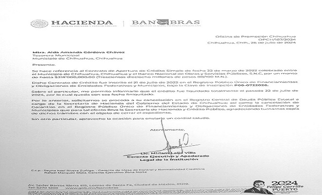 Bonilla Mendoza, informó que fue el pasado lunes 22 de julio cuando se logró liquidar completamente el crédito, el cual fue solicitado en marzo de 2022. Esto significa que el Gobierno Municipal de Chihuahua, ya puede cancelar el registro y garantías de esta deuda, para quedar totalmente liberados ante la Secretaría de Hacienda Estatal.