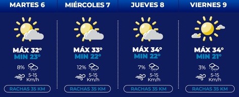 El martes, la máxima será de 32°C y la mínima de 23°C, con cielo parcialmente nublado y un 8 por ciento de probabilidad de lluvia; mientras que para el miércoles, se pronostica una mínima de 22°C y una máxima de 33°C, con cielo parcialmente nublado y 12 por ciento de probabilidad de lluvia.
