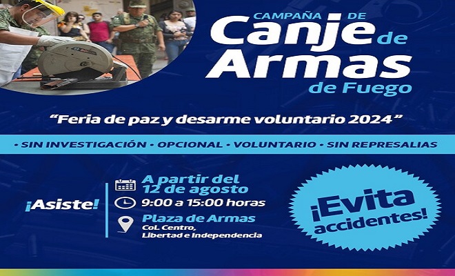 La campaña tiene el objetivo de fomentar la seguridad y el bienestar de la ciudadanía, mediante el canje voluntario de armas de fuego del 12 al 24 de agosto, en un horario de 9:00 am a 3:00 pm, en el kiosco de la Plaza de Armas.