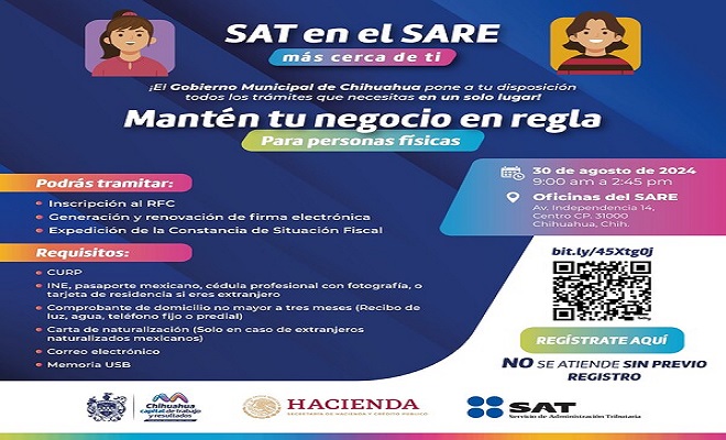 Ciudad de Chihuahua.- La Dirección de Desarrollo Económico y Competitividad municipal en colaboración con el Servicio de Administración Tributaria (SAT), informa a la población que el próximo viernes 30 de agosto podrán realizar trámites fiscales y administrativos para personas físicas en las instalaciones del SARE.