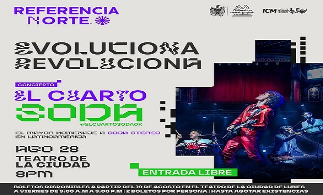 Ciudad de Chihuahua.- El Instituto de Cultura del Municipio invita a todos los interesados a asistir al concierto de El Cuarto Soda, homenaje a Soda Stereo, a recoger hasta dos boletos gratuitos por persona a partir de hoy, lunes 19 de agosto en la taquilla del Teatro de la Ciudad, de lunes a viernes en un horario de 9:00 am a 3:00 pm.