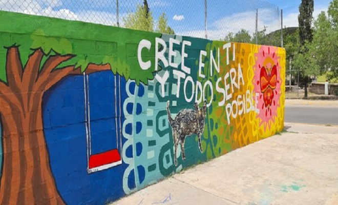 Ciudad de Chihuahua.- Plasman conceptos de ecología y motivacionales en murales comunitarios, como parte del programa Mi Colonia es mi Casa, que promueve la Dirección de Seguridad Pública Municipal (DSPM) en conjunto con vecinos de la colonia UP.