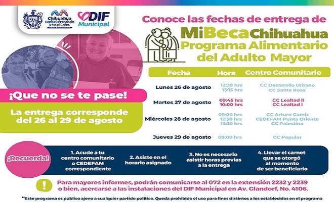Ciudad de Chihuahua.- Da a conocer el DIF municipal a solicitantes del Programa Alimentario del Adulto Mayor (PAAM), que podrán acudir por su entrega del 26 al 29 de agosto: