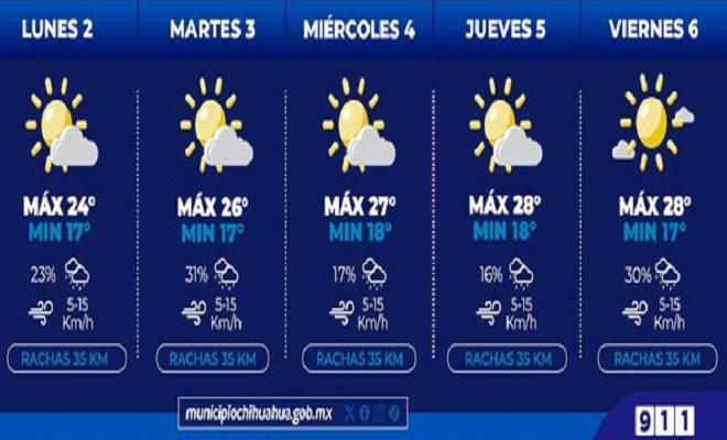 Ciudad de Chihuahua.- La Coordinación Municipal de Protección Civil informa que, para esta semana, del 2 al 6 de septiembre, se pronostican temperaturas máximas de 28°C y mínimas de 17°C, además de lluvias ligeras para toda la semana con cielos parcialmente nublados.
