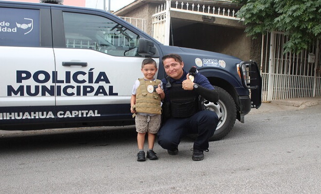 Ciudad de Chihuahua.- Municipales adscritos al grupo de Proximidad, alegraron el día de David Mateo, un pequeño de 6 años que festejó su cumpleaños acompañado de los agentes, quienes arribaron a su casa de manera sorpresiva para compartir con él este momento especial y charlar sobre sus aspiraciones como policía.