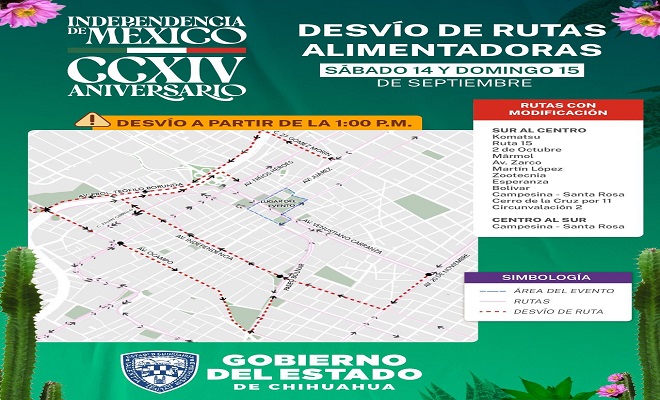 Ciudad de Chihuahua.- La Secretaría General de Gobierno, a través de la Subsecretaría de Transporte, da a conocer las modificaciones temporales en las rutas del servicio de transporte que van hacia la zona centro de la ciudad, derivadas de los festejos por el aniversario de la Independencia de México.