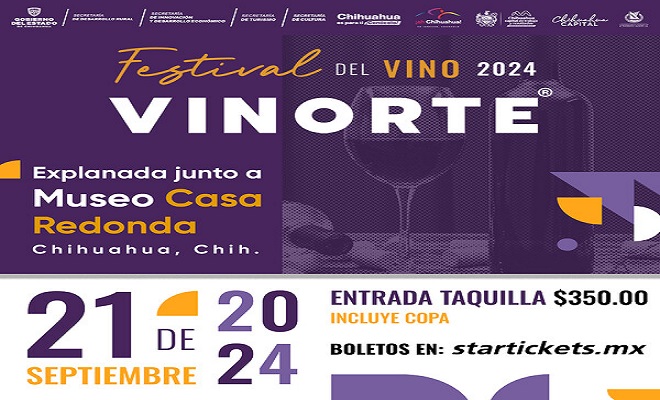 Ciudad de Chihuahua.- El Municipio, invita a las familias chihuahuenses a disfrutar del “Festival Vinorte” edición 2024, organizado por el Clúster Vitivinícola, el cual se llevará a cabo este sábado 21 de septiembre de las 13:00 a las 22:00 horas en las instalaciones del Museo Casa Redonda.