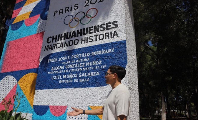 Ciudad de Chihuahua.- Tras su participación en la prueba de Salto de Altura de los Juegos Olímpicos París 2024, el atleta cuauhtemense Erick Josué Portillo Rodríguez plasmó su firma en el lienzo de los Olímpicos Chihuahuenses.