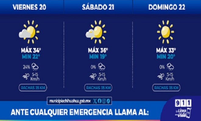 Ciudad de Chihuahua.- La Coordinación Municipal de Protección Civil, informa que este fin de semana, del 20 al 12 de septiembre , se prevén temperaturas máximas de 36°C y mínimas de 19°C, así como una ligera probabilidad de lluvias.