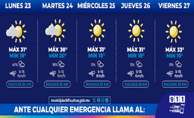 El jueves, se espera una máxima de 31°C y una mínima de 18°C, con cielo soleado. El viernes, la temperatura alcanzará los 33°C con una mínima de 19°C, cielo soleado. Ante cualquier emergencia, llame al 9-1-1, la Línea de la Vida.