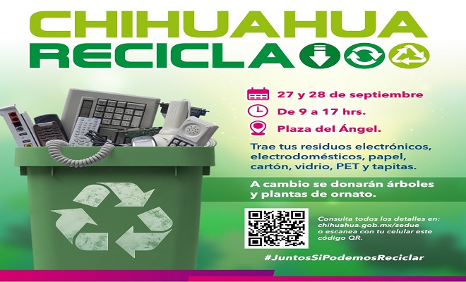 Chihuahua.- Este 27 y 28 de septiembre, se realizará el evento “Chihuahua Recicla 2024”, en la Plaza del Ángel de 9:00 am a 5:00 pm, en donde se recibirán electrónicos, cartón, papel, PET, tapas de plástico o vidrio, mismos que se intercambiarán por árboles y flores de ornato.