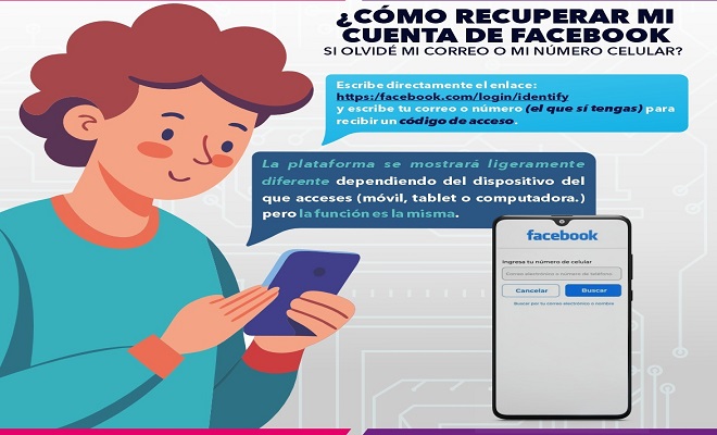 * Recuperar cuenta si olvidaste tu correo o número de celular: Ingresa a facebook.com/login/identify, escribe el dato que sí recuerdes (correo o celular) para recibir un código de acceso.