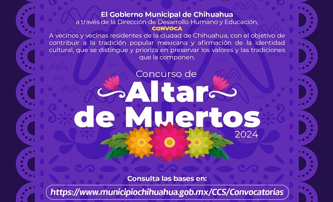 Chihuahua.- La Dirección de Desarrollo Humano y Educación, invita a todos los comités de vecinos conformados en la ciudad de Chihuahua, a participar en el concurso de “Altares de Muertos 2024”, con el objetivo de contribuir a la tradición popular mexicana y afirmación de la identidad cultural, que se distingue y prioriza en preservar los valores y las tradiciones que la componen.