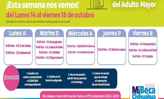 Ciudad de Chihuahua.- El DIF municipal, informa a solicitantes del Programa Alimentario del Adulto Mayor (PAAM) los Centros Comunitarios a los que podrán acudir por su entrega, del 14 al 18 de octubre.