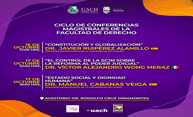 Ciudad de Chihuahua.- La Facultad de Derecho de la Universidad Autónoma de Chihuahua realizará este 16 de octubre la ponencia «Constitución y globalización» en el Auditorio Cruz Miramontes a las 17:00 horas, dentro de su tradicional Ciclo de Conferencias Magistrales.