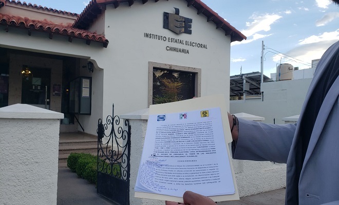 Chihuahua.- Las dirigencias estatales del PRI, PAN, y PRD ratificaron ante el Instituto Estatal Electoral su convenio de coalición de cara a la elección extraordinaria para la alcaldía y sindicatura del Municipio de Ocampo, además de la sindicatura de Belisario Domínguez; misma que tendrá lugar el 8 de diciembre del presente año, dio a conocer el líder priista Alejandro Domínguez.