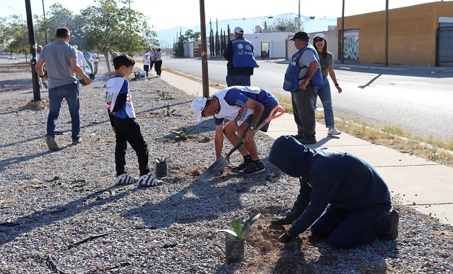 Ciudad de Chihuahua.- La Dirección de Mantenimiento Urbano, Grupo Vértice y la Fundación Grupo México, plantaron este sábado un aproximado de 450 plantas y árboles endémicos de esta región, con la finalidad de rescatar espacios urbanos que requieren más vegetación, mejorar la imagen urbana y con ello ayudar al planeta.
