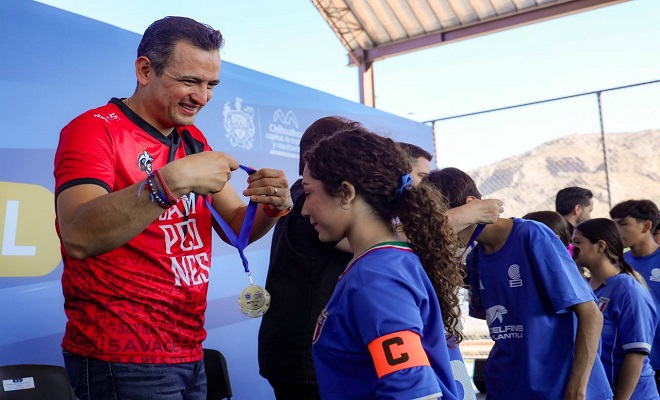 Ciudad de Chihuahua.- Los equipos de futbol mixto del COBACH 4, CBTIS 122 y UVM Preparatoria, fueron premiados por el alcalde Marco Bonilla, al quedar en primer, segundo y tercer lugar respectivamente en el Torneo por la Salud Mental “Grítalo, Háblalo, Sácalo” organizado por el Instituto Municipal de Prevención y Atención a la Salud (IMPAS) con la finalidad de crear conciencia en las y los jóvenes de la importancia de la salud mental.