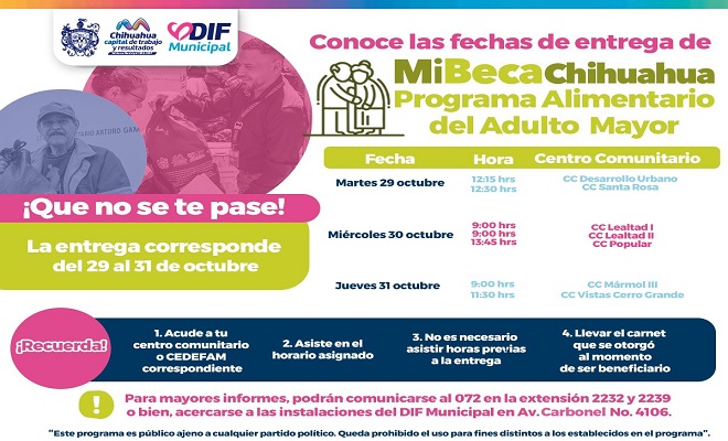 Ciudad de Chihuahua.- El DIF municipal, informa a solicitantes del Programa Alimentario del Adulto Mayor (PAAM) los centros comunitarios a los que podrán acudir por su entrega del 29 al 31 de octubre.