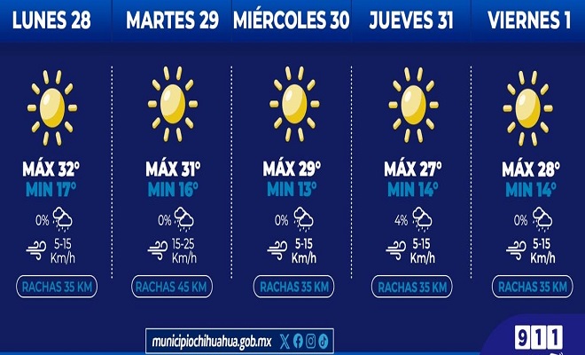 Ciudad de Chihuahua.- La Coordinación Municipal de Protección Civil, informa que, para esta semana, del 28 de octubre al 01 de noviembre, continuarán las mañanas frescas con mínimas de 13°C, por lo que exhortan a cuidarse de los cambios de temperatura.
