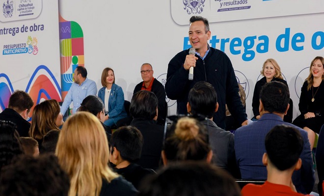 Ciudad de Chihuahua.- El alcalde Marco Bonilla, hizo entrega a vecinos y usuarios de los espacios deportivos del parque Urueta, de nuevo domo, baños y graderías con techumbre de la cancha de futbol, gracias al Presupuesto Participativo 2024.