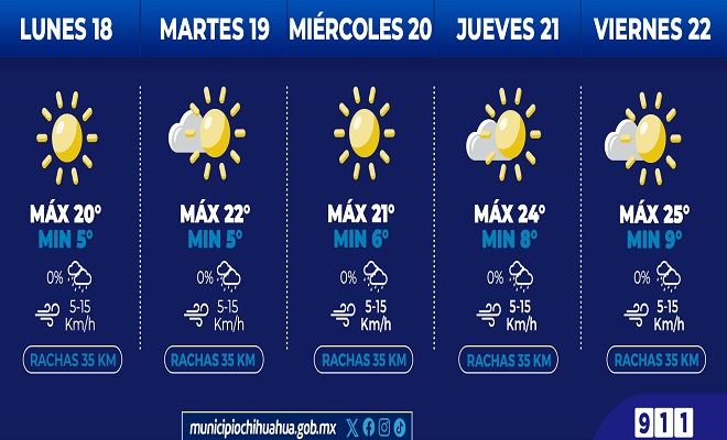 Ciudad de Chihuahua.- La Coordinación Municipal de Protección Civil, informa que, para esta semana, del 18 al 22 de noviembre, se pronostican temperaturas máximas de 25°C con mínimas de 5°C.