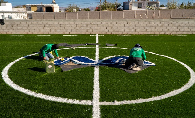 Ciudad de Chihuahua.- Da a conocer la Dirección de Obras Públicas municipales, la construcción de la cancha de futbol rápido en escuela Primaria Vicente Suarez, con un registro de avance del 80 por ciento.