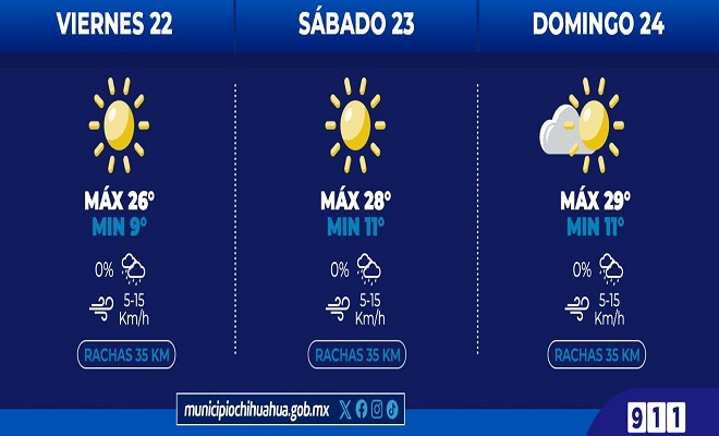 Ciudad de Chihuahua.- La Coordinación Municipal de Protección Civil, informa que este fin de semana, del 22 al 24 de noviembre, se prevén temperaturas máximas de 29°C y mínimas de 9°C.