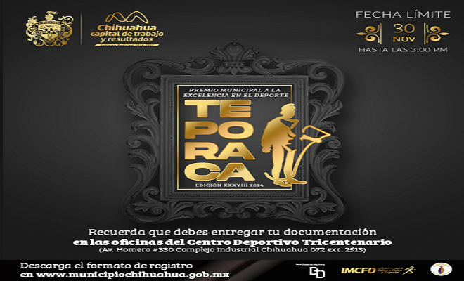Las bases de la convocatoria, así como el formato de registro las podrán consultar en la página oficial del Gobierno Municipal de Chihuahua: https://www.municipiochihuahua.gob.mx/CCS/Convocatorias/Premio_Municipal_a_la_Excelencia_en_el_Deporte_Teporaca_2024.