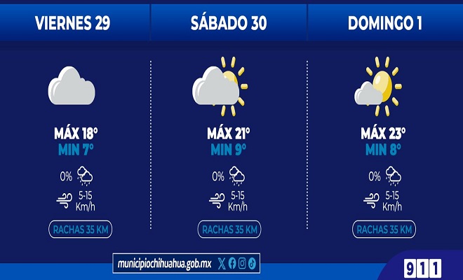 Chihuahua.- La Coordinación Municipal de Protección Civil, informa que este fin de semana, del 29 de noviembre al 1 de diciembre, se prevén temperaturas máximas de 23°C y mínimas de 7°C.