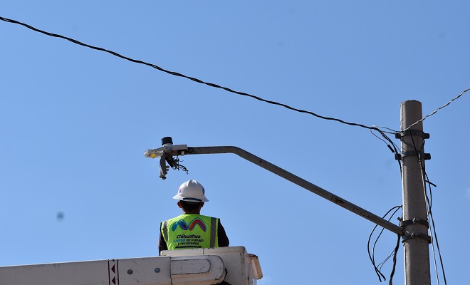 Ciudad de Chihuahua.- La Dirección de Mantenimiento Urbano, lleva un avance del 70 por ciento en la modernización del alumbrado público de la zona rural del Sauz, que comprende los poblados de Nuevas Delicias y División del Norte, en beneficio de más de 2 mil 500 habitantes del sector.