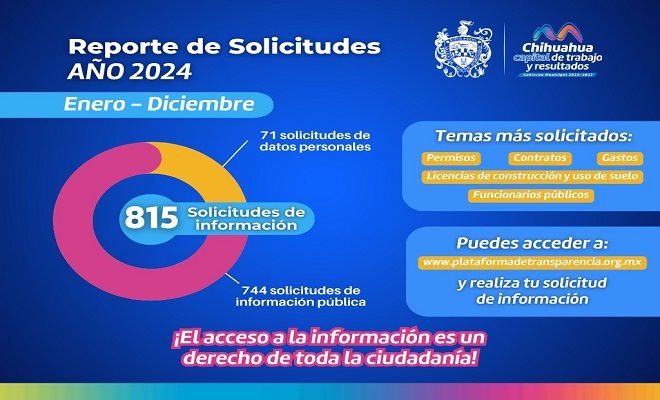 Ciudad de Chihuahua.- El Gobierno Municipal recibió 815 solicitudes de información durante el año 2024, de las cuales 744 fueron de información pública y 71 de datos personales.