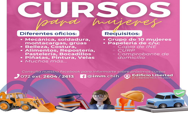Además, los requisitos para solicitar los cursos grupales son: contar con un lugar disponible para impartir el curso, y la papelería de cada una de las mujeres interesadas (copia de INE, CURP y comprobante de domicilio).