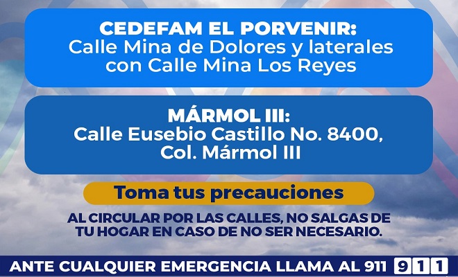 Ante las bajas temperaturas la Coordinación Municipal de Protección Civil, solicita a la ciudadanía a reportar al 9-1-1 a personas durmiendo en la vía pública para ser canalizadas a uno de los dos refugios, uno ubicado en la el CEDEFAM El Porvenir al norte de la ciudad en calle Mina de Dolores y laterales con calle Mina Los Reyes; y el centro comunitario Mármol III al sur de la Capital entre las calles Eusebio Castillo y Ernesto Malda.