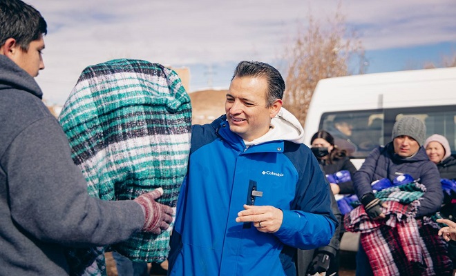 Ciudad de Chihuahua.- Por la nevada que cayó en la ciudad, el alcalde Marco Bonilla, la presidenta del DIF Municipal Karina Olivas, así como personal de dicha dependencia y de Desarrollo Humano y Educación, llevaron apoyos a familias de Ladrilleras Norte para que se resguarden del frío y eviten enfermedades.