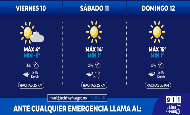 Ciudad de Chihuahua.- La Coordinación Municipal de Protección Civil, comparte que, para este fin de semana del 10 al 12 de enero, se prevén temperaturas mínimas de -5°C, por lo que exhortan a cuidarse del frío.