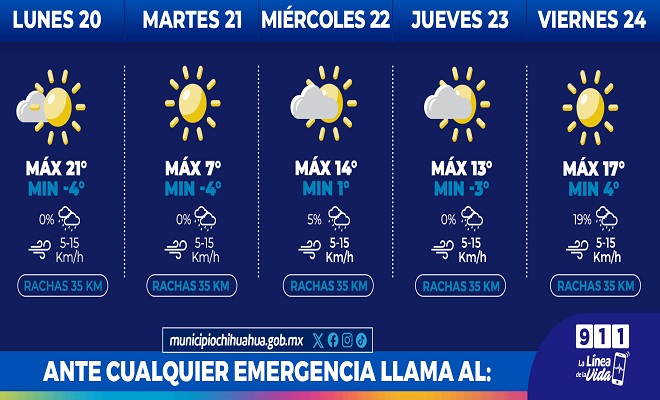 Ciudad de Chihuahua.- La Coordinación Municipal de Protección Civil, informa que para esta semana se pronostican temperaturas mínimas de hasta -4°C, por lo que exhortan a tomar las medidas necesarias para evitar enfermedades respiratorias y cuidar la salud.